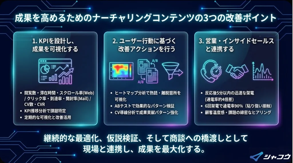 ナーチャリングコンテンツは一度作って終わりではありません。成果を最大化するには、運用後の振り返りと改善のプロセスが欠かせません。ここでは、コンテンツを継続的に最適化していくための3つの視点を紹介します。