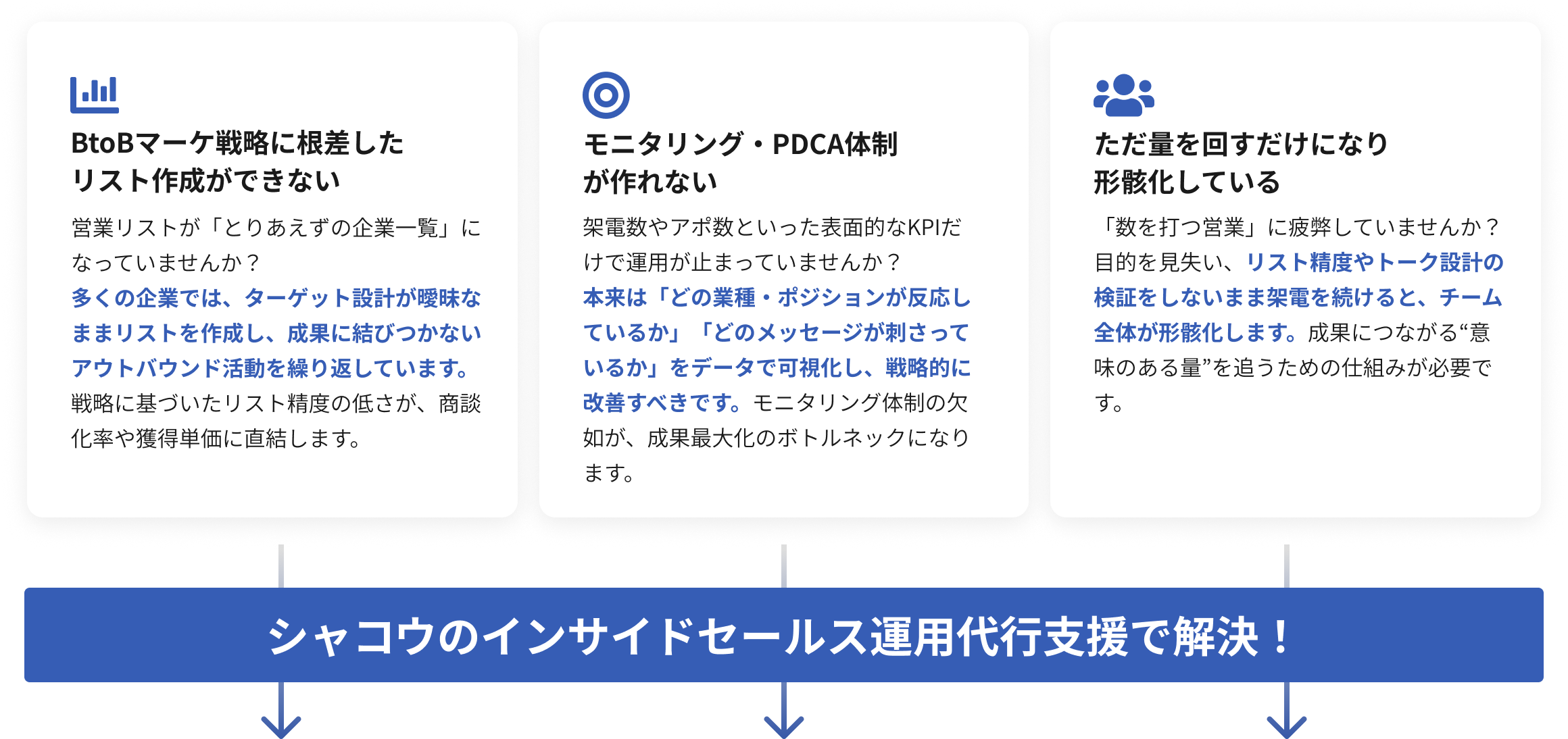 インサイドセールス運用代行支援の上流戦略設計から下流実務まで一貫して実行しているシャコウ